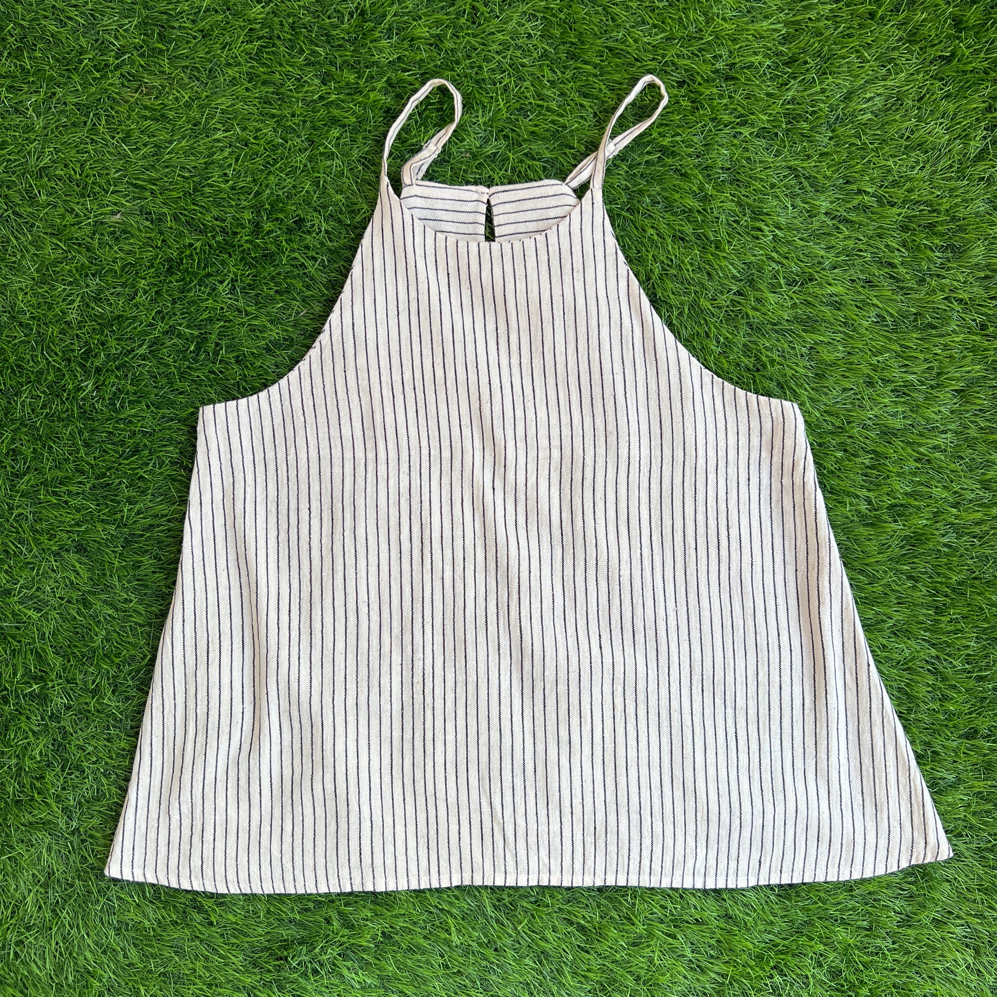 The minimalist striped pattern and airy silhouette make it a perfect choice for warm days. Designed for comfort and versatility, it pairs beautifully with skirts, shorts, or denims — a timeless piece for your sustainable wardrobe.
